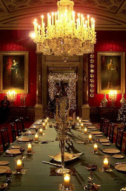 a large table spreads out in front of you. it is fully set with fine china and gold...